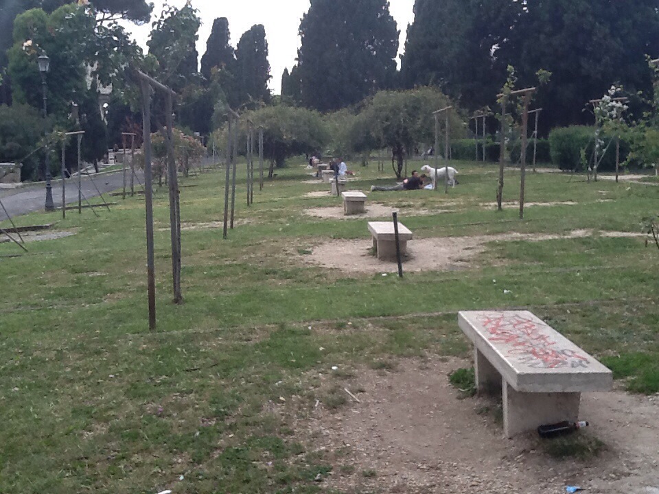 Ci sono tanti stranieri, in certi periodi si accampano, c’è una mensa della Caritas vicina, è vero. Ma Colle Oppio è un posto frequentato dai romani, da bambini che giocano a pallone quando escono da scuola, da badanti dell’est che vanno a fare due chiacchiere su una panchina nelle ore libere, da studenti che si portano gli appunti e li ripetono mormorando.
